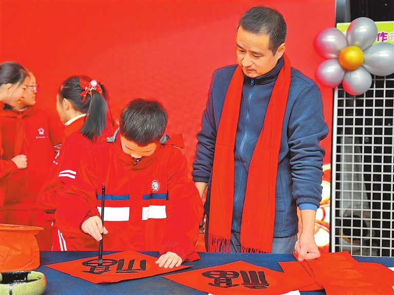 1月7日,在“2025河南文艺界新春欢乐行”焦作分会场,书法家与小学生们自由“组队”,铺展红纸,一停一顿、一起一落间,一幅幅寓意吉祥的“福”字在他们笔下绽放。 姬姣姣 摄