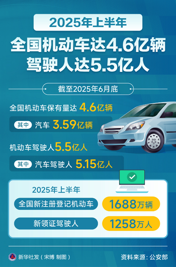 新华社北京7月14日电(记者任沁沁)公安部14日发布最新统计,截至2025年6月底,全国机动车保有量达4.6亿辆,其中汽车3.59亿辆;机动车驾驶人5.5亿人,其中汽车驾驶人5.15亿人。2025年上半年全国新注册登记机动车1688万辆,新领证驾驶人1258万人。